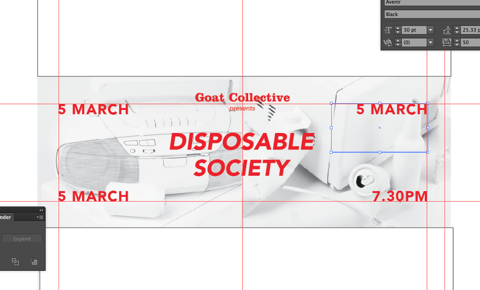 To fit with the design of our posters I was able to knock up a header for social media in the same style, keeping the format minimal and only including the vital information. I made sure to keep 'goat collective' and 'disposable society' in the centre so it would show up as a smaller icon.